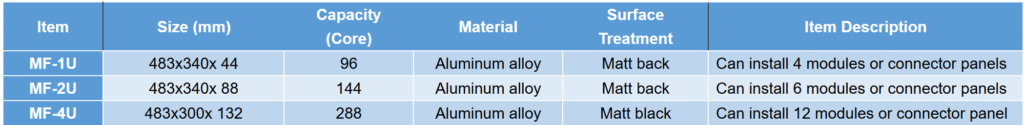 • High-density design, 1/2/4U for 96/144/288-core connections(LC adapter) or 216/864-core connections(MTP/MPO adapter)