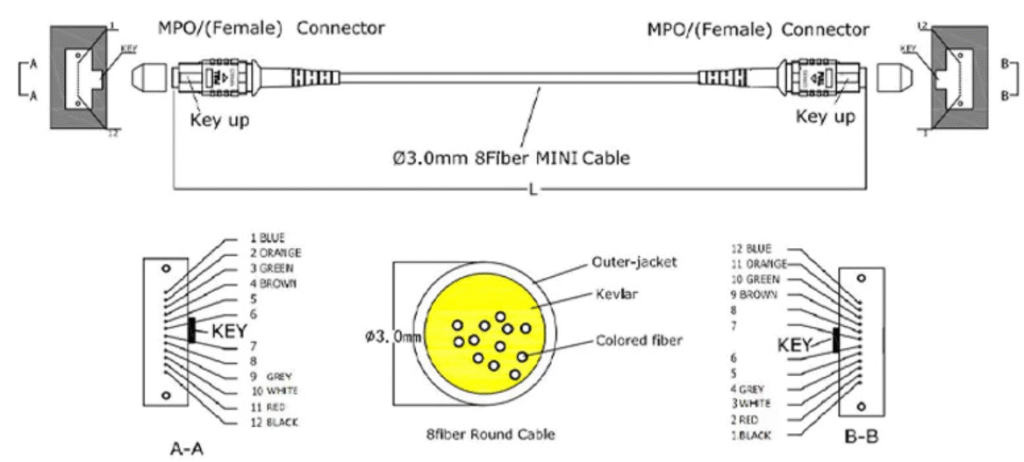 These multi-fiber cables from L-com offer up to 8 times the density compared to the same size SC connector. These cables connect equipment in data centers where 10 to 40Gbps ethernet connections are required and are specifically designed to work with 40G QSFP transceivers. Made with a Low Smoke Zero Halogen (LSZH) jacket, it gives off very little smoke and does not produce toxic halogen-based gasses. Type B is a Key Up to Key Up connector configuration and refers to the connector’s polarity. This cable comes with alignment pins. These are also fully compatible with US Conec MTP products.